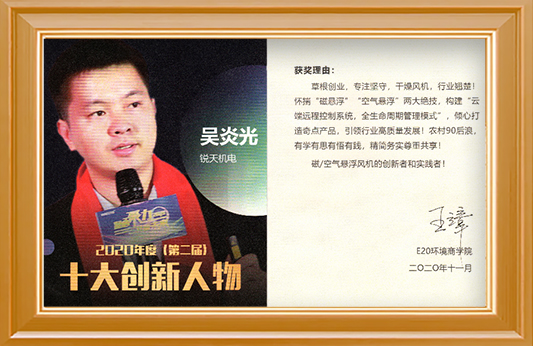 1、NG娛樂總經(jīng)理吳炎光榮獲環(huán)境商學院2020屆“十大創(chuàng)新人物”,傾心打造奇點NG娛樂“空氣懸浮風機”和“磁懸浮風機”;